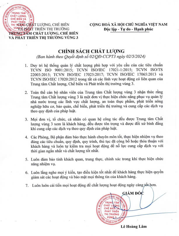 * Quyết định số 02/QĐ-CCPT3 ngày 02/5/2024: Công bố chính sách chất lượng của